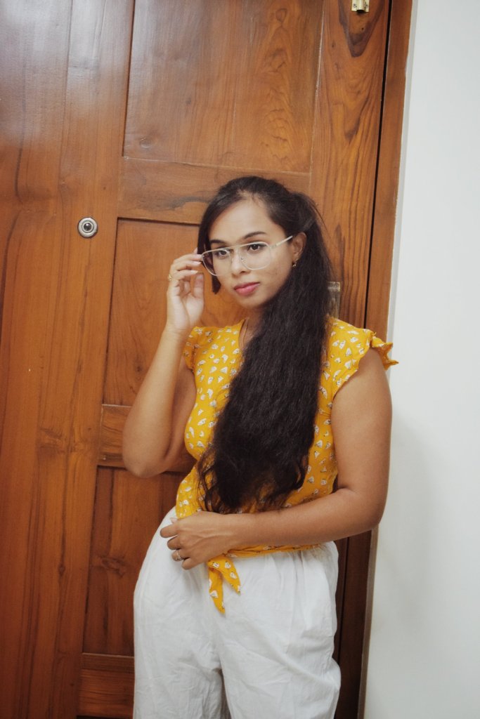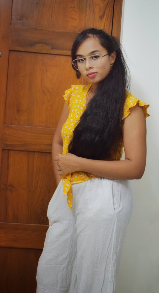 Here I styled plain palazzo with a cute knot shirt and added a classic touch with the glasses and a high ponytail hairstyle. You can even style with a simple plain shirt or denim shirt tucked-in. This look is classy at its finest!