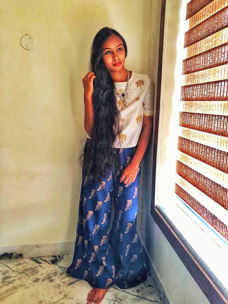 I paired this beautiful blue palazzo which has owl print on it with a white crop top, which has a palm print. You can mix and match the color and pattern you like. If you want to glam up your desi look, then this will be your savior.